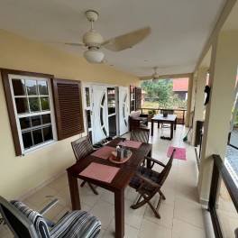 De tropische uitstraling van deze woning dankt zij aan haar brede voorterras. Vanuit dit terras betreedt u een ruime woon- en eetruimte en een open keuken. De keuken grenst aan een werkkamer en een ruime pantry/berghok. Vanuit de woonkamer betreedt u een gang die toegang biedt tot de slaapkamers en de badkamer met toilet. Tussen de master bedroom en de slaapkamer staat een walk-in closet. Alle badkamers zijn uitgerust met stijlvol en degelijk sanitair. Verder is het gehele huis voorzien van airconditioning.