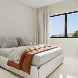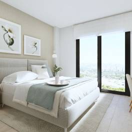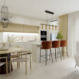 Moderne woningen met 3 slaapkamers en 2 badkamers, een ruime woonkamer met open keuken en schuiframen die toegang geven tot het terras.
