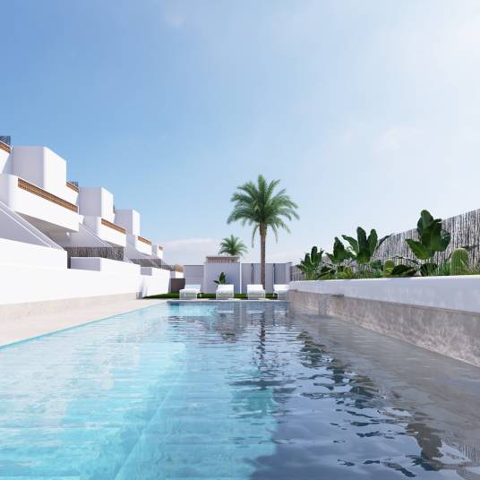 Deze volledig gemeubileerde appartementen zijn beschikbaar in twee typen: appartementen op de begane grond en dakappartementen met een privé solarium. Elk appartement beschikt over drie slaapkamers, twee volledig afgewerkte badkamers, een praktische berging en biedt toegang tot een ruim gemeenschappelijk zwembad. Moderne voorzieningen, zoals elektrische rolluiken in de badkamer en zowel binnen- als buitenverlichting, zijn inbegrepen in de prijs, wat bijdraagt aan een hoog wooncomfort.
