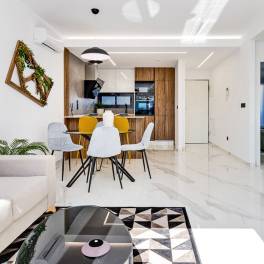 Modern appartement van 80 m² bestaande uit 2 slaap- en 2 badkamers met open woonkamer en keuken die direct toegang bieden tot het terras waar je kunt genieten van een prachtig uitzicht over het landschap en de lagune. De woning is afgewerkt in een delicaat en functioneel ontwerp en combineert perfect het binnen met buiten. Kortom, een moderne en frisse omgeving om je mediterrane dagen door te brengen. Fantastisch volledig gemeubileerde appartementen met absoluut alles inbegrepen om ervoor te zorgen dat je helemaal gesetteld bent!