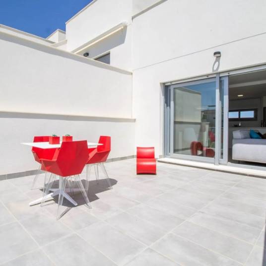 De appartementen op de bovenste verdieping bieden daarentegen een uitgestrekt terras, perfect om te genieten van het prachtige uitzicht en het warme weer. Naast het grote terras beschikken ze ook over een privé dakterras, wat nog meer buitenruimte biedt voor ontspanning, dineren of zonnebaden. Deze bovenste units bieden een werkelijk verhoogde levensstijl, met een panoramisch uitzicht op de omliggende omgeving, waardoor ze ideaal zijn voor degenen die op zoek zijn naar meer privacy en luxe.