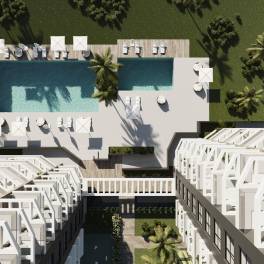 Dit moderne appartement beschikt over 2 slaapkamers en 2 badkamers, en biedt toegang tot een gemeenschappelijk zwembad, ondergrondse parkeergarage en een breed scala aan luxe voorzieningen.