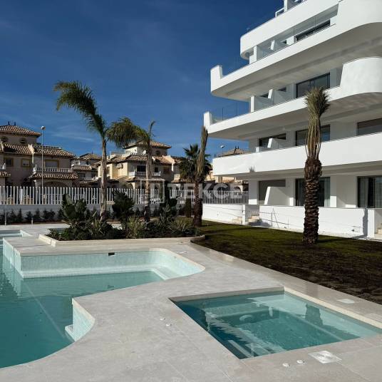 Gunstig Gelegen Appartementen met 2 en 3 Slaapkamers Nabij Voorzieningen in Lomas de Cabo Roig OrihuelaDeze elegante appartementen zijn gelegen in Lomas de Cabo Roig, een aantrekkelijke woonwijk die deel uitmaakt van Cabo Roig. Dit gebied ligt op slechts 2 kilometer afstand van het strand van Cabo Roig en biedt een heerlijke sfeer aan zee in de regio Costa Blanca, gelegen aan de oostkust van Spanje, met twee ongerepte stranden met blauwe vlag.Appartementen te koop in Orihuela Cabo Roig zijn gunstig gelegen op loopafstand van de dagelijkse voorzieningen. Bovendien zijn ze slechts 2,5 kilometer verwijderd van het beroemde open winkelcentrum La Zenia Boulevard, 3 kilometer van de Cabo Roig-strip en het strand, 5 kilometer van de populaire 18-holes golfbaan Villamartin en Villamartin Plaza, 13 kilometer van de stad centrum van Torrevieja, en bevinden zich op minder dan een uur rijden van de internationale luchthavens van Alicante en Murcia.De appartementen maken deel uit van een eigentijdse gemeenschap die toegang biedt tot een ruim gemeenschappelijk zwembad, omgeven door weelderige groene zones en schaduwrijke ruimtes, evenals gemeenschappelijke fitnessfaciliteiten.In de appartementen ontdekt u slaapkamers met inbouwkasten. De grootste slaapkamer beschikt over een en-suite badkamer met een inloopdouche. Verder beschikken de appartementen over een extra badkamer met inloopdouche, een goed uitgeruste open keuken, een eethoek en een royale woonkamer versierd met grote ramen in Franse stijl die uitkomen op het zonneterras.De appartementmodellen op de begane grond hebben ook een privétuin, terwijl de penthousemodellen een privédaksolarium hebben. ALC-00575