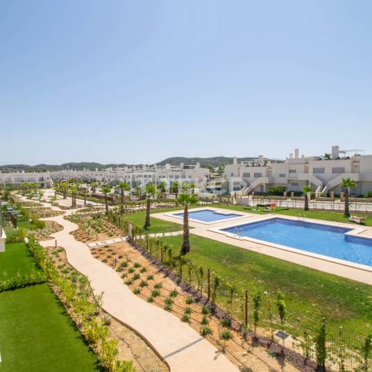 Luxe Appartementen met Zwembad Dichtbij een Golfbaan in Orihuela, AlicanteDeze nieuwgebouwde appartementen bevinden zich in Orihuela, een stad in het zuiden van de regio Valencia, in de provincie Alicante. Alicante is de op één na dichtstbevolkte provincie van de regio Valencia en herbergt ook Elche, de derde grootste stad in de regio. Deze ligging maakt het een ideale keuze voor de aankoop van een appartement in Orihuela of ergens anders in de regio Valencia.De zorgvuldig ontworpen appartementen liggen op loopafstand van een golfbaan. Daarnaast liggen ze op slechts 5,5 km van het Rufete Avonturenpark, waar u activiteiten kunt doen zoals boogschieten, paardrijden en quadrijden. Het traditionele Spaanse stadje San Miguel de Salinas ligt op slechts 8 km afstand, terwijl het ziekenhuis van Torrevieja zich op 14 km afstand bevindt. Het strand ligt op ongeveer 16 km afstand en zowel de internationale luchthavens van Alicante als Murcia bevinden zich op ongeveer 60 km van de appartementen.Appartementen te koop in Orihuela Alicante maken deel uit van een nieuw residentieel complex dat gemeenschappelijke parkeergelegenheid biedt en alle bewoners toegang geeft tot een groot gemeenschappelijk zwembad en groene zones.De stijlvolle appartementen beschikken over goed ingerichte slaapkamers, elk voorzien van inbouwkasten. De hoofdslaapkamer heeft een en-suite badkamer met een inloopdouche. De ruime woonkamer heeft grote Franse ramen die uitkomen op een zonneterras, waardoor er veel natuurlijk licht binnenvalt. De appartementen zijn verder voorzien van een volledig uitgeruste open keuken, een open eetruimte en een extra badkamer voor gasten. Het aantal kamers varieert afhankelijk van het type appartement. Daarnaast kunnen appartementen, afhankelijk van het model, beschikken over een privétuin of een privé-solarium. ALC-00440