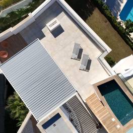 Upstairs the solarium is fully equipped with a private plunge pool, shower and outdoor kitchen/bar area. There is plenty of space for sunbathing, lounging around the fireplace and dining al fresco, especially with the motorised pergola enabling a quick switch between sun or shade.