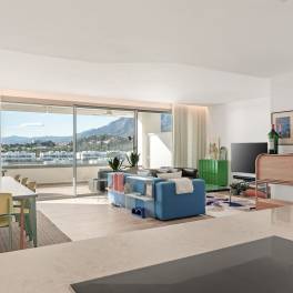 The living room with designated dining and lounge area is very wide and gives access to the covered terrace with open views to the sea and mountains.