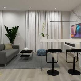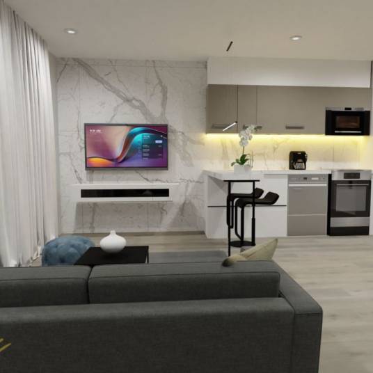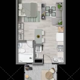Een studio-appartement van ongeveer 50m2 (binnen + terras). Dit model bevindt zich in Gebouw B "Guadeloupe" en Gebouw D "Barbados". Beide gebouwen zijn 7 verdiepingen hoog en zijn uitgerust met twee liften. Hoe hoger de verdieping, hoe beter het uitzicht!