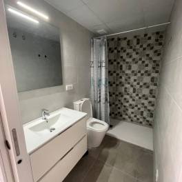 Badkamers met met douche-wasmeubel en toilet. Grote badkamer heeft ene wasmachine opstelling. keuken met afzuigkap – vaatwasser- oven-koelkast. Aparte kast voor boilerinstallatie en voorraad. 2 slaapkamers met inbouwkasten met schuifdeuren. De hele woning is getegeld met moderne tijdloze plavuizen. Balkon met trap naar het dakterras. Dakterras voorzien van drainagetegels en douche. Het appartement heeft overal airconditioning, de ramen in de slaapkamers en schuifpui in de woonkamer zijn voorzien van rolluiken. Aan de balkon zijde heb je vrij uitzicht op de bergen, vanaf het dakterras kijk je over de appartementen naar de zee.