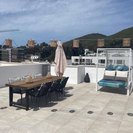 Op Ibiza, een schitterend 3 kamer appartement met een schitterend dakterras gelegen in het Oosten van het eiland, zeer centraal gelegen in het centrum van ST-Eularia een heerlijke plaats waar alles aanwezig is om het hele jaar door te kunnen genieten. parkeerplaats op 50 meter van het appartement, 5 minuten lopen naar de haven en het strand. Een heerlijk appartement met veel daglicht toetreding. 3e verdieping (2 liften aanwezig) woonkamer met balkon en een prachtig zeer groot dakterras van 75 m2.