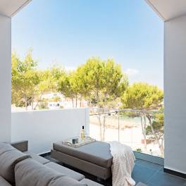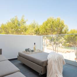 Binnen baadt het appartement in natuurlijk licht, wat het gevoel van ruimte en sereniteit versterkt. De open indeling verbindt de woonkamer naadloos met het terras, waardoor er een vloeiende overgang ontstaat tussen comfort binnenshuis en genieten buitenshuis. Hoogwaardige materialen, verduisterende rolluiken en zonneschermen zorgen voor zowel gemak als privacy, terwijl het algehele ontwerp zich richt op eenvoud, elegantie en gebruiksgemak. Een eigen berging zorgt voor extra functionaliteit, waardoor dit huis net zo functioneel als mooi is.