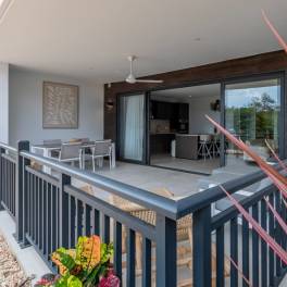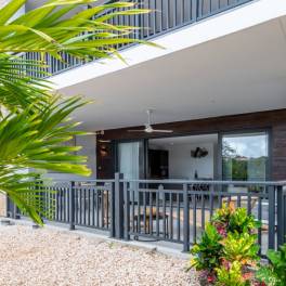 Dit stijlvolle appartement beschikt over twee ruime slaapkamers, elk met een ensuite badkamer voorzien van modern Europees sanitair, een luxe badmeubel, een hangtoilet en een inloopdouche. Het woongedeelte heeft een open karakter en staat in directe verbinding met de moderne keuken, compleet met kookeiland, hoogwaardige inbouwapparatuur en een Amerikaanse koelkast met water- en ijsdispenser.De schuifpui verbindt de woonkamer met de royale porch, waardoor een naadloze overgang tussen binnen- en buitenleven ontstaat. Hier geniet u van het ultieme Caribische buitenleven, met een vrij uitzicht over een groene oase van Blue Bay Resort. Dankzij de slimme positionering van de gebouwen geniet u niet alleen van een heerlijk verkoelende bries, maar ook van maximale privacy op uw balkon, zonder inkijk van andere appartementen.Daarnaast is het appartement uitgerust met energiezuinige airconditioning in de woonkamer en beide slaapkamers, waardoor u het hele jaar door een aangename temperatuur behoudt. Een interne was- en opslagruimte met wasmachine en droger is aanwezig. Per appartement is er een vaste parkeerplaats, met extra bezoekersplekken op het terrein.
