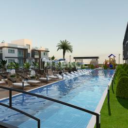 Appartementen die Sociaal Leven en Strandcomfort Bieden in Yeni BoğaziçiDe appartementen te koop in Gazimağusa, Noord-Cyprus, zijn gelegen in het Yeni Boğaziçi Salamis-gebied aan de oostkust. Dit is een van de meest gewilde regio’s van het eiland voor zowel wonen als investeren, dankzij de gouden zandstranden, brede wandelpaden, rustige sfeer en zich ontwikkelende infrastructuur. Het ononderbroken uitzicht op zee, de nabijheid van de historische Salamis-ruïnes en de levendige hotel-toerisme-activiteit van het gebied maken het een ideale omgeving voor zowel korte vakanties als langdurig wonen.Deze unieke nederzetting is gepland in een compacte complexstructuur bestaande uit 48 woningen, met als doel de bewoners een resort-achtige levensstijl te bieden. Tot de uitstekende kenmerken van het complex behoren een strandshuttleservice op gezette tijden, een café & à la carte restaurant, een kinderspeeltuin, een aquapark, een sauna, een massageruimte, een fitnessruimte, barbecueplekken en een groot Olympisch zwembad. Het complexbeheer biedt ook diensten voor huur- en huurdersbeheer, wat een aanzienlijk voordeel is voor investeerders.Het complex beschikt over open parkeerplaatsen, en de aangelegde tuinen, ondersteund door wandelpaden, bieden een esthetisch aangename en functionele omgeving. De appartementen zijn verkrijgbaar in verschillende indelingen, elk ontworpen met een open keuken, ruime woonruimtes en een comfortabele woonervaring. Grote ramen maximaliseren natuurlijk licht, en sommige appartementen kijken uit op het zwembad van het complex, terwijl andere uitzicht bieden op het omringende open landschap. ECN-00578