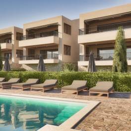 Voor elke woning is er een zwembadgedeelte met een set van twee ligbedden en een parasol. Elk appartement heeft een overdekte parkeerplaats van bamboe met pergola.