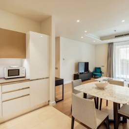 Een volledig gemeubileerd appartement met 1 slaapkamer en 1 badkamer op de begane grond in Village Residences met 69 m² interieur + 29 m² terras (totaal 98 m²). Het terras grenst aan de prachtige tuinen rondom het complex, wat zorgt voor extra buitenruimte. Het appartement beschikt over een zwembad en een ondergrondse parkeergarage.