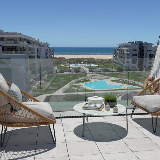 FRONT LINE BEACH APARTMENTS – LOS CAMALEONES These lovely apartments offer fabulous views to the sea, pool and communal gardens. Walking distance to amenities and only 45 minutes to the nearest airport. As well as shopping centres there is a wide variety of gastronomic and leisure activities. The proximity to the town of Ayamonte – just under 10 minutes by car – allows you to enjoy one of the prettiest Andalusian villages in Spain and next door, just across the River Guadiana the Portuguese Algarve. • Spacious communal gardens and pool areas • Fitted kitchen and Pre-installation for air conditioning • Private parking spaces.