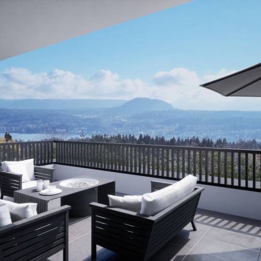 De woonruimtes variëren van 73,18 tot 83,79 vierkante meter, elk met ruime terrassen en grote raampuien die een ononderbroken uitzicht bieden op de Wörthersee en de indrukwekkende bergachtergrond. De ligging op het zuiden optimaliseert het natuurlijke zonlicht en biedt tegelijkertijd een rustige en ontspannen leefomgeving.