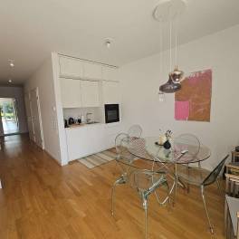 De op maat gemaakte keuken met Miele-apparatuur, die zelfs nog uitgebreid kan worden, en de perfect uitgeruste badkamer met inloopdouche en sanitair van Villeroy & Boch, gecombineerd met kranen van Hans Grohe, zijn zonder twijfel van hoge kwaliteit! Het appartement is uitgerust met exclusieve plafondverlichting en heeft overal – behalve in de ruim betegelde badkamers – eikenhouten vloeren. Alle ruimtes zijn voorzien van vloerverwarming (centrale verwarming op pellets), en de ramen en deuren zijn bijna kamerhoog en uitgerust met elektrische buitenjaloezieën.