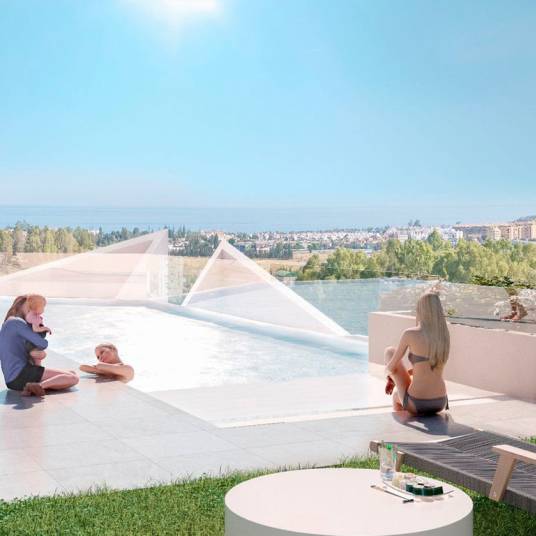 This south-facing apartment with sea views enjoys a great location on the border of Nueva Andalucia and San Pedro, within walking distance to all amenities and a 20-minute walk to the beach. The apartment features a living and dining area leading to the private terrace, a separate, semi-fitted kitchen, three bedrooms and two bathrooms. There is hot and cold air-conditioning throughout. The apartment is part of a new development, featuring communal areas including gardens, a rooftop terrace with pool and a gym.Ready to move inPhotos, views and layout may vary and are for illustrative purposes only