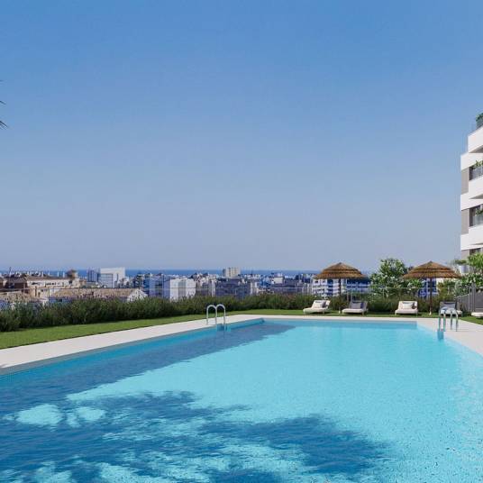 A new development featuring modern apartments with sea views, located in the heart of Estepona, just a 15-minute walk to the beach and close to all amenities. There are apartments with two and three bedrooms for sale, all with a fully fitted kitchen and fitted with hot and cold air-conditioning. Communal gardens surround the two saltwater pools. Other facilities include a gym, a social club and a co-working area. Estepona is a beautiful coastal town on the western Costa del Sol offering everything you need to enjoy a Mediterranean lifestyle. The properties for sale are ideal as a holiday home, second residence or investment property. Underground parking and a storage room is included in the purchase price. Completion expected November 2025Prices from € 510,000 – € 650,000Prices for apartments with two bedrooms from € 510,000 – € 650,000Prices for apartments with three bedrooms from € 535,000 – Photos, views and layout may vary and are for illustrative purposes only
