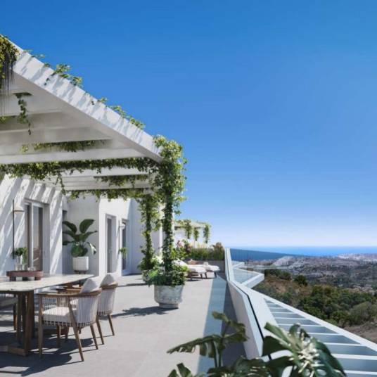 This unique residential complex comprises 50 modern sea-view apartments divided into 3 construction phases. Located close to Mijas Pueblo and surrounded by nature, this residential complex offers a tranquil and relaxed lifestyle. All properties enjoy a desirable southwest orientation and are offered with two or three bedrooms. The buildings have been designed with a focus on privacy, incorporating hanging gardens to create the sensation of green waterfalls. Floor-to-ceiling windows seamlessly connect the open-plan living areas with the generously sized terraces, flooding the interior with an abundance of natural light. The purchaser will have the option to choose from a rich catalog of flooring, tiling, fittings, and finishes for the kitchen furniture. Communal areas include an outdoor infinity pool, a separate children’s pool, a wellness area with a sauna, Turkish bath, and a fully equipped training area. These properties present an excellent option for anyone looking for a second home on the Costa del Sol, set in a beautiful area with amazing sea views and superb facilities. Underground parking and a storage room are included in the purchase price.Completion date end 2028Prices from € 538,700 – € 1,099,890Prices for apartments with two bedrooms from € 538,700 – € 598,700Prices for apartments with three bedrooms from € 612.000 – € 754,919Prices for penthouse apartments with three bedrooms from € 977,900- € 1,099,890Photos views and layout may vary and are for illustrative purposes only