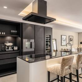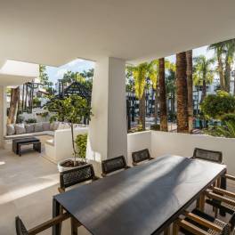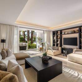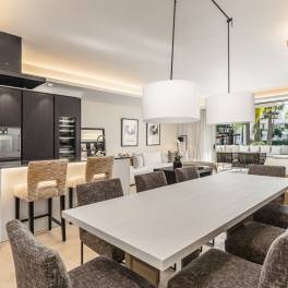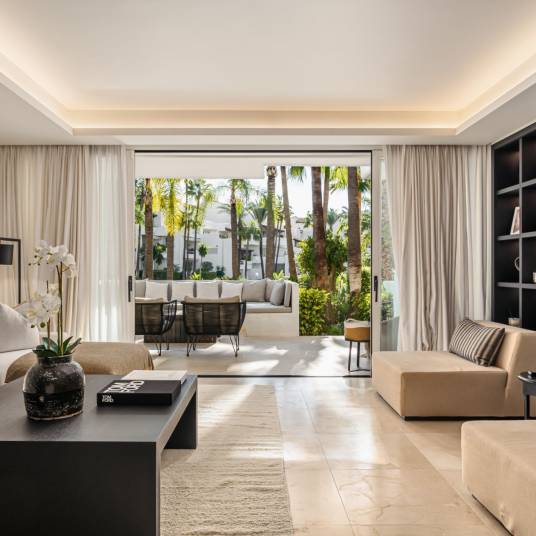 In het exclusieve Jardín Japonés-complex binnen het prestigieuze Puente Romano resort aan de Golden Mile van Marbella bevindt zich een elegant drie-slaapkamerappartement dat de essentie van kustluxe weerspiegelt. Volledig gerenoveerd in 2023, met 188 m² binnenruimte en een zuidoostelijk terras van 48 m², combineert het eigentijds comfort met klassieke elegantie. Het appartement kijkt uit over de Japanse tuinen en het zwembad en biedt een open indeling met veel licht. De keuken met op maat gemaakte eiken kasten en Gaggenau-apparatuur sluit naadloos aan op de woonkamer en eetruimte, die toegang geven tot het ruime terras. Elke slaapkamer beschikt over een en-suite badkamer met natuursteen en houten afwerking. De hoofdslaapkamer heeft directe toegang tot het terras. Oorspronkelijk gebouwd in 1992 en volledig gemoderniseerd, verenigt het de tijdloze charme van Puente Romano met modern design. De beveiligde community met 24-uursbewaking ligt op loopafstand van het Puente Romano Beach Resort & Spa, waar toprestaurants zoals Nobu, Leña en Dani García te vinden zijn. Dichtbij zijn internationale scholen, luxe winkels en het centrum van Marbella. Een uitzonderlijke kans om te wonen op een van de meest begeerde locaties van de Costa del Sol.