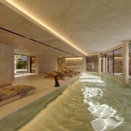 Hoge afwerking: porseleinen vloeren, vloer-tot-plafond schuifdeuren van glas, volledig uitgeruste designkeukens met Siemens apparatuur, gecentraliseerde airconditioning met zonebesturing, aerothermisch warm water en vloerverwarming in badkamers.