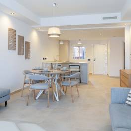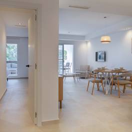 Het appartement beschikt over twee lichte en comfortabele slaapkamers, een moderne badkamer en een open woonkamer die naadloos aansluit op het terras. Elk detail is zorgvuldig ontworpen om een warme en gastvrije sfeer te creëren.