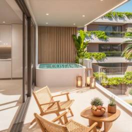 Appartementen op de begane grond met privétuinen en enkele units met zwembaden in strandstijl