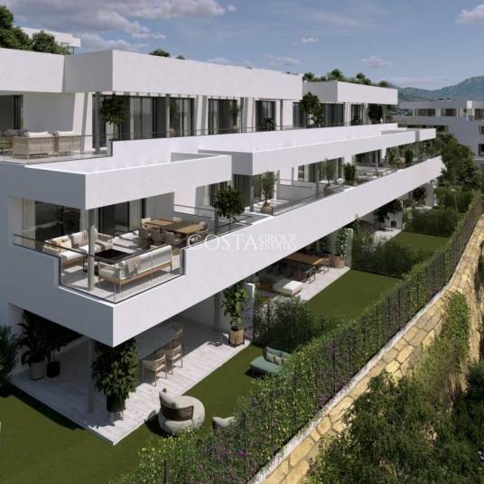 Privé wooncomplex met zwembad, tuin en kinderspeelplaats. Bij het ontwerp van deze woonwijk is gestreefd naar integratie met de omgeving, waarbij gebruik is gemaakt van de topografie van het perceel, waardoor 360º uitzicht op de zee en de bergen mogelijk is.
