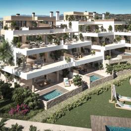 Gelegen in de prestigieuze regio van Marbella, biedt dit exclusieve wooncomplex een selectie van appartementen en begane grond woningen, ontworpen voor degenen die op zoek zijn naar een luxueuze levensstijl. Met slechts 7 beschikbare eigendommen, biedt elk indrukwekkend uitzicht op zee, wat zorgt voor een serene en bevoorrechte omgeving. De nabijheid van de zee, op slechts 4 km, en de golfbaan, op 450 meter, maakt deze locatie ideaal voor sport- en natuurliefhebbers. Bovendien ligt de luchthaven op 40 km afstand, wat de toegang tot internationale verbindingen vergemakkelijkt. De woningen zijn uitgerust met airconditioning, vloerverwarming en moderne apparatuur, wat maximaal comfort en energie-efficiëntie garandeert. Ingebouwde kasten en porseleinen tegelvloeren voegen een vleugje elegantie en functionaliteit toe aan elke ruimte.BUITENRUIMTESDe buitenruimtes van deze eigendommen in Marbella zijn ontworpen om optimaal te genieten van het mediterrane klimaat. Elke woning beschikt over een privétuin en een terras, perfect om buiten te ontspannen of te genieten van diners in de open lucht. De aanwezigheid van pergola’s voegt een vleugje verfijning toe en biedt schaduw tijdens zonnige dagen. Het uitzicht op zee vanaf de terrassen is een waar genot voor de zintuigen, met een spectaculair panorama dat zich uitstrekt tot aan de horizon. De nabijheid van de zee en de golfbaan maakt het mogelijk om te genieten van buitenactiviteiten in een ongeëvenaarde natuurlijke omgeving.BINNENRUIMTESHet interieur van deze woningen in Marbella is zorgvuldig ontworpen om een gastvrije en functionele ruimte te bieden. De indelingsopties omvatten eigendommen met 3 of 4 slaapkamers en 3 of 4 badkamers, die voldoen aan de behoeften van elk gezin. Vloerverwarming en airconditioning zorgen voor een comfortabele omgeving gedurende het hele jaar. Porseleinen tegelvloeren geven een moderne en elegante uitstraling, terwijl ingebouwde kasten zorgen voor efficiënte en discrete opslag. De opname van hoogwaardige apparaten in de keuken vergemakkelijkt de dagelijkse taken, waardoor elk huis een praktische en comfortabele plek is om te wonen.GEMEENSCHAPPELIJKE RUIMTESDe gemeenschappelijke ruimtes van deze residentie in Marbella zijn ontworpen om een exclusieve en ontspannende levensstijl te bieden. Bewoners kunnen genieten van uitgestrekte aangelegde gebieden, ideaal om te wandelen of gewoon te ontspannen in een groene en rustige omgeving. Het gemeenschappelijke zwembad is perfect om af te koelen tijdens de warme zomerdagen, terwijl de gemeenschappelijke fitnessruimte een actieve levensstijl mogelijk maakt zonder het huis te verlaten. Bovendien biedt de gemeenschappelijke garage comfort en veiligheid voor de voertuigen van de bewoners.