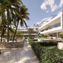 De luxe afwerking omvat volledig geïnstalleerde airconditioning, elektrische vloerverwarming in de badkamers, moderne keukens met inbouwapparatuur en basisdomoticasystemen. Het interieur is uitgevoerd in rustgevende neutrale tinten, natuurlijke hout- en steentexturen en heeft grote ramen van vloer tot plafond die de binnen- en buitenruimtes naadloos met elkaar verbinden.