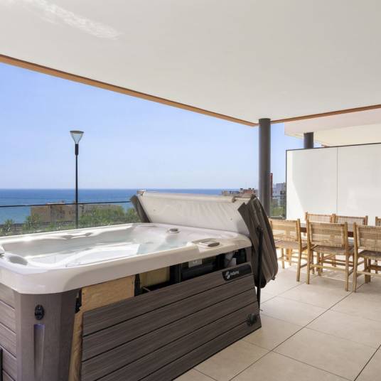 This apartment features 3 spacious bedrooms, 2 modern bathrooms, and an open-concept living area that leads to a magnificent 63m² terrace. The terrace is perfect for entertaining, with a built-in barbeque and a private jacuzzi where you can relax and enjoy the breathtaking views of the Fuengirola coastline.