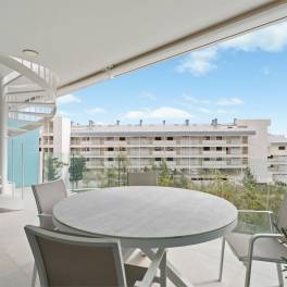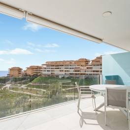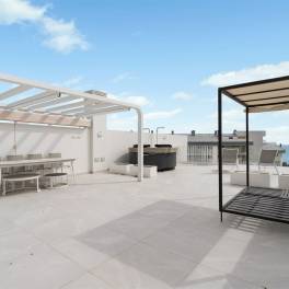 The property has a modern style and offers two bedrooms and two bathrooms, one of which is en-suite. The open kitchen and living room create a spacious and inviting atmosphere. Through the sliding doors, we access a southwest-facing terrace of 22 sqm with an impressive view of the Mediterranean Sea. Additionally, there is a rooftop terrace of 107 sqm with an installed jacuzzi, perfect for relaxation.