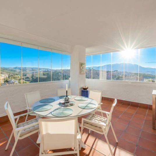 From the main terrace, you can enjoy views of the communal swimming pool and landscaped gardens, while the front terrace, accessible from the bright living room and the master bedroom, has been enclosed with Lumon glass curtains. This additional space creates a perfect area for reading, dining, or simply enjoying the panoramic views of La Duquesa Golf Course, the surrounding mountains, and the peaceful Andalusian countryside.