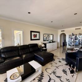 The apartment is west-facing and in excellent condition, featuring a spacious living area with marble flooring, a fully fitted kitchen, and a private terrace where you can take in panoramic views of the sea and mountains. Additional features include air conditioning (hot and cold), double glazing, fitted wardrobes, lift access, storage room, utility room, and an en-suite bathroom.
