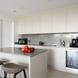 The spacious living area is filled with natural light, enhanced by a rare side feature window found only in select apartments. A large, fully equipped kitchen with Bosch and Miele appliances, including a built-in wine cooler, makes dining and entertaining effortless, while the sale of the property includes all crockery, glassware, and cookware. Jacobsen furniture, stylishly integrated throughout, is also included in the price.
