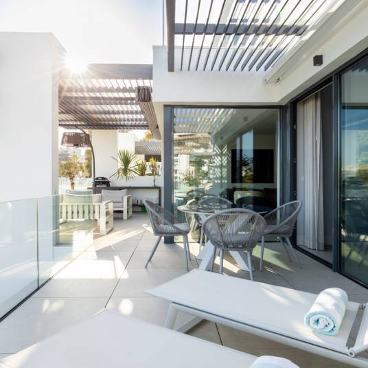 This beautifully designed two-bedroom, two-bathroom apartment offers a harmonious blend of comfort and sophistication in one of the most sought-after areas of the Golf Valley. Located in Urbanization Aqualina wiith 112 m² of interior living space and a generous 43 m² private terrace, the property provides the perfect setting for relaxed living and elegant entertaining.
