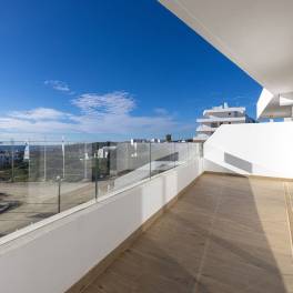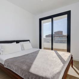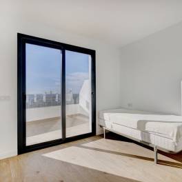 To the right of the entrance, a hallway leads to the private night area, where the main bedroom is with its en-suite bathroom, and a well-appointed bedroom, with an external bathroom, also used as a guest bathroom. Both bedrooms enjoy direct terrace access, abundant natural light, and stunning sea views.