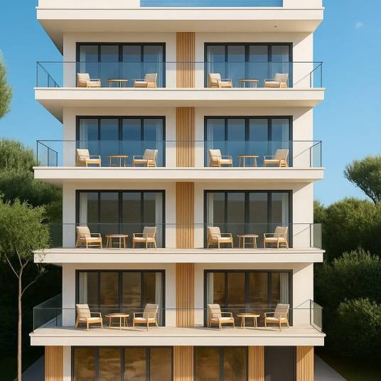 Alle appartementen zijn gebouwd volgens hoge kwaliteitsnormen en worden volledig gemeubileerd en gebruiksklaar opgeleverd. De badkamers zijn voorzien van inbouwmeubilair, verlichte spiegels, elektrische handdoekrekken en doucheschermen. De keukens zijn volledig uitgerust met moderne apparatuur en eigentijdse kasten. Er is airconditioning met split-units geïnstalleerd, wat het hele jaar door comfort garandeert. Grote schuifdeuren met drie rails tussen de woonkamer en het terras kunnen volledig worden geopend, waardoor de binnen- en buitenruimtes worden geïntegreerd en er meer natuurlijk licht binnenkomt.