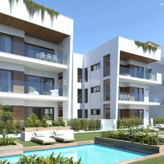 Kies uit appartementen met 2 of 3 slaapkamers, allemaal met 2 badkamers (waarvan één en suite) en ruime buitenruimtes. De woningen op de begane grond hebben een eigen tuin, die op de tussenverdiepingen hebben een ruim terras en de penthouses op de bovenste verdieping hebben een eigen solarium, perfect om van de zon te genieten, buiten te eten of gewoon te ontspannen in uw eigen oase van rust.