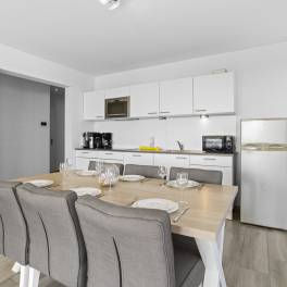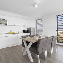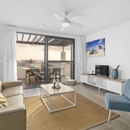 Das helle, geräumige Wohnzimmer geht nahtlos in eine voll ausgestattete offene Küche über und bietet direkten Zugang zu einer großen, teilweise überdachten Terrasse – der perfekte Ort, um laue Abende, eine erfrischende Brise und spektakuläre Sonnenuntergänge zu genießen.