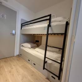 Het appartement (eerste verdieping) is bemeubeld en bestaat uit een kamer met stapelbed voor 2 personen, badkamer en toilet, zetelbed in de living, ingerichte keuken en balkon.