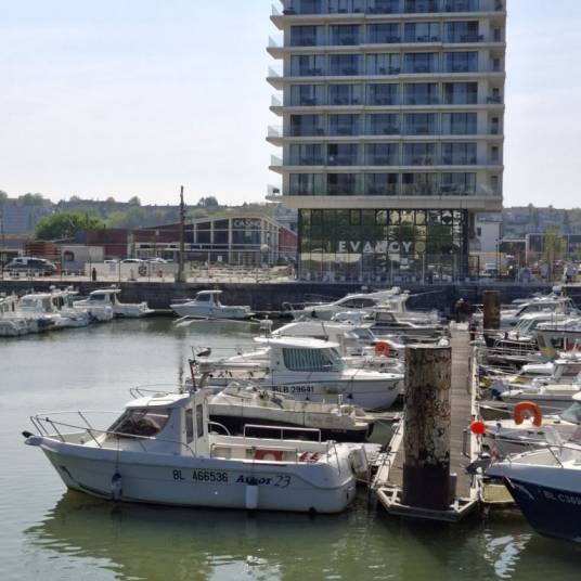 Modern en recent (bouwjaar 2019) appartement te koop met schitterend zicht over de haven van Boulogne-sur-Mer (Frankrijk).