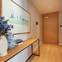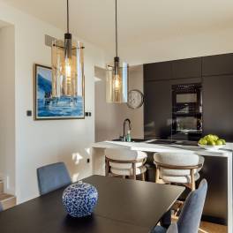 De open woon-, eet- en keukenruimte baadt in natuurlijk licht dankzij kamerhoge schuifdeuren en plafondramen, die direct uitkomen op een groot L-vormig terras vol tropisch groen en bloemen. De designkeuken is voorzien van hoogwaardige Miele-apparatuur, een kookeiland met bar en een eethoek, ideaal voor bijeenkomsten. Op maat gemaakte inbouwkasten bieden overal voldoende opbergruimte. Met zijn houten parketvloeren, zachte kustkleuren, elegante verlichting en een 6 meter hoog plafond in de woonkamer biedt deze woning een gevoel van ruimte en verfijning dat moeilijk te evenaren is.