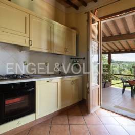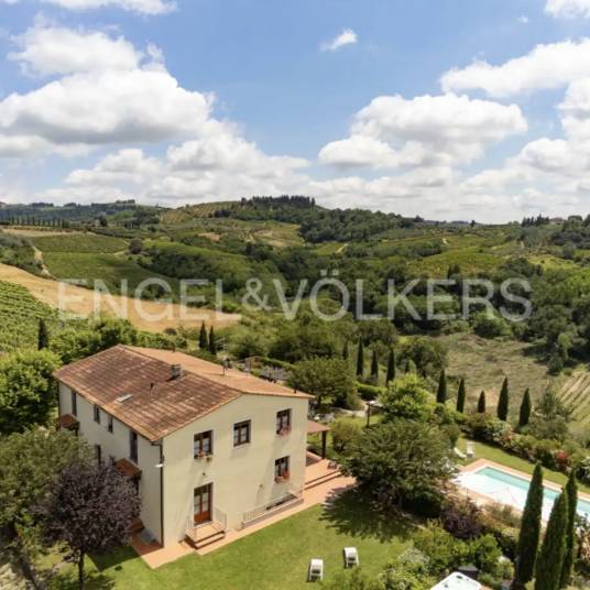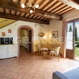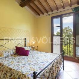 Lovely portion of farmhouse in the countryside of Certaldo | This lovely property is located in a farmhouse nestled in the heart of the Florentine Chianti region, surrounded by vineyards and with stunning open views over the Tuscan countryside. The farmhouse was completely renovated in the early 2000s and is currently divided into three comfortable twin apartments, each with its own private garden with barbecue and driveway access. This unit, free on three sides, is very bright and enjoys an excellent exposure with a view of the sunset. The entrance is on a large living room, with double French window; continuing we find the habitable kitchen with direct access to a private patio for eating outside and enjoying the view, and a service bathroom. Going upstairs, we have two very bright double bedrooms with splendid views of the hills, a bathroom and a utility room. The spaces are large and comfortable and are furnished in classic Tuscan taste. From the garden, via external stairs, we reach the basement floor where we find a large storage room with laundry. Some common areas complete the property, including a panoramic swimming pool with sunset views and a children’s play area. Finally, there are solar panels and air conditioning. The property is ideal both as a first and second home, thanks to its proximity to services and, at the same time, to renowned places of tourist and cultural interest.