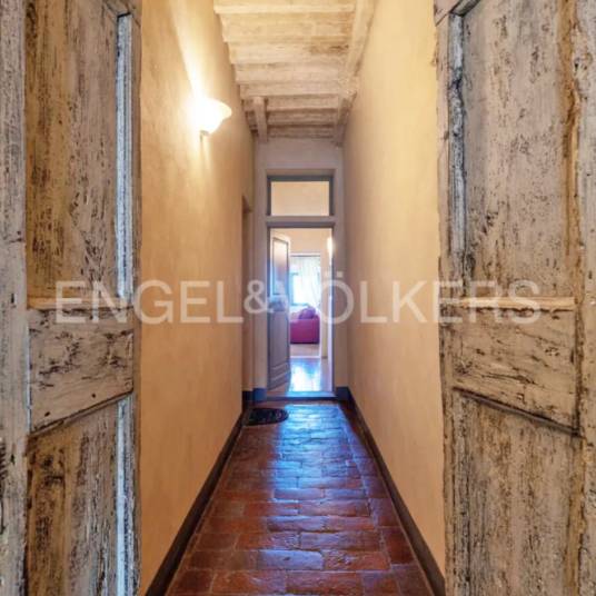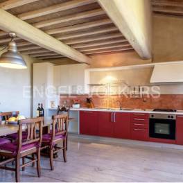 Renovated apartment in the historic centre of Barberino Val d’Elsa with spectacular views | This flat is a perfect fusion of traditional elements, such as beamed and vaulted ceilings, with a more modern and refined interior design. Located on the first floor of an ancient medieval building, it has recently been renovated with great attention to detail and the use of high-quality materials and enjoys a breathtaking view over the picturesque Florentine Chianti valley. It is on one level, except for the second bedroom with en-suite bathroom, which is located on the second floor. As soon as you cross the threshold, you are greeted by a spacious entrance area that includes a well-equipped kitchen and a cosy living room. Through a corridor, you reach a recently tastefully renovated bathroom, followed by the spacious master bedroom. Ascending the beautiful staircase, you reach the second floor where you find the second bedroom with en-suite shower and the bathroom. Numerous free parking spaces are available in the vicinity of the apartments. Residents are also guaranteed free access to the entire limited traffic zone (ZTL) of the municipality, ensuring comfortable mobility in the area.
