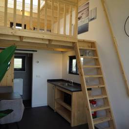 Tiny House 2 staat voor intiem recreëren dichtbij de natuur op slechts enkele vierkante meters. Het vrijstaande chalet bestaat uit 2 verdiepingen en is geschikt voor maximaal 2 personen. De Tiny House is slim ingedeeld en geeft u een knus en sfeervol gevoel. Op de begane grond vind u een knusse en eigentijds ingerichte woonkamer met zithoek, televisie en palletkachel. Verder is er een keuken met kookplaat, koffiezetapparaat en magnetron en een kleine eethoek met eettafel. De badkamer bestaat uit een wastafel, douche en toilet. Boven, onder het dak, bevindt zich een slaapvide met tweepersoonsbed. Op uw eigen terras met tuinmeubilair kunt u genieten van de buitenlucht. Nabij de Tiny House kunt u de auto parkeren.