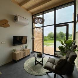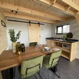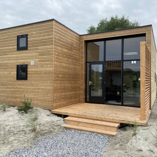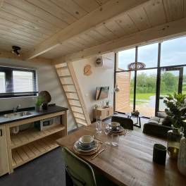 Tiny House 4 brengt u dichter bij de natuur onder het motto "Minder huis, meer leven". Het vrijstaande chalet is geschikt voor 4 personen en bestaat uit twee gekoppelde Tiny houses (tiny house 2) met een tussendeur. De Tiny House beschikt over 2 slaapzolders, die bereikt kunnen worden met een ladder. U kunt niet helemaal rechtop staan op de slaapzolder. In de knusse woonruimte beschikt u over een zithoek met televisie en 1 keuken met onder andere een kookplaat en een koffiezetapparaat. Er zijn twee badkamers voorzien van een toilet, douche en wastafel. Buiten kunt u aan beide kanten van het chalet relaxen op het terras met tuinmeubilair.