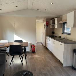 Comfort van binnen en buiten, daar staat deze 4-persoons vakantiewoning voor. De mooie locatie met uitzicht over de tuin bindt de ogen elke dag weer op prettige wijze, daarnaast is de woning zelf ook onderscheidend. Zowel van binnen als buiten zijn onderhoudsvriendelijke materialen gebruikt, verder is ze volledig geïsoleerd en voorzien van dubbele beglazing. De grote ramen verschaffen u elke dag weer een mooie aanblik over het ‘groen’ wat het gevoel van rust en ruimte, waar een vakantie veelal voor staat, versterkt. Datzelfde doet ook het terras aan de voorzijde van de vakantiewoning.Het gevoel van rust en ruimte is ook van toepassing wanneer u de woning binnengaat. U komt direct in de grote living met open keuken die bestaat uit een keukenblok en alle benodigde keukenaccessoires. Dit laatste houdt in dat u beschikt over een kookplaat, afzuigkap, koel-vriescombinatie, vaatwasser, magnetron, oven en een kraan met daaronder een rvs spoelbak.Vanuit de living heeft u direct toegang tot de gang waar de twee slaapkamers en de badkamer zijn gelegen. Voor beide geldt dat, net als bij de living en de keuken, ze compleet met mooie materialen worden ingericht.
