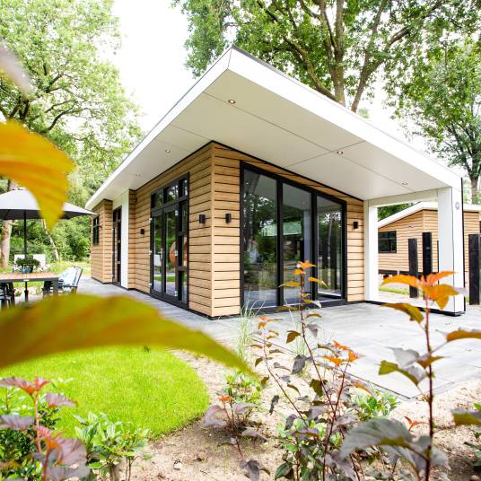 Beschikbaar op huur- of koopkavel Omschrijving Dit is de stijlvolle en comfortabele Boslodge Silva. Deze vakantiewoning is, met 2 slaapkamers, geschikt voor 4 tot 5 personen en biedt gegarandeerd een fijn verblijf midden in de Gelderse bossen. Extra genieten van de natuurrijke omgeving? De Boslodge Silva is optioneel uit te breiden met privé wellnessfaciliteiten. Dit zorgt voor het ultieme vakantiegevoel. De woonkamer, eethoek en keuken van de Boslodge Silva stralen warmte, sfeer en comfort uit. Dit maakt het een fijne plek om te verblijven en blijvende vakantieherinneringen te maken. Door de vele ramen wordt de woning feilloos verbonden met de natuurrijke omgeving. Het schuine dak geeft de woning daarbij een unieke uitstraling, zowel van buiten, als van binnen bekeken. In de slaapkamers is het heerlijk tot rust komen op comfortabele tweepersoons boxspringbedden. De woning voor 5 personen beschikt over een slaapkamer met een tweepersoonsbed en een slaapkamer met een enkel- en een